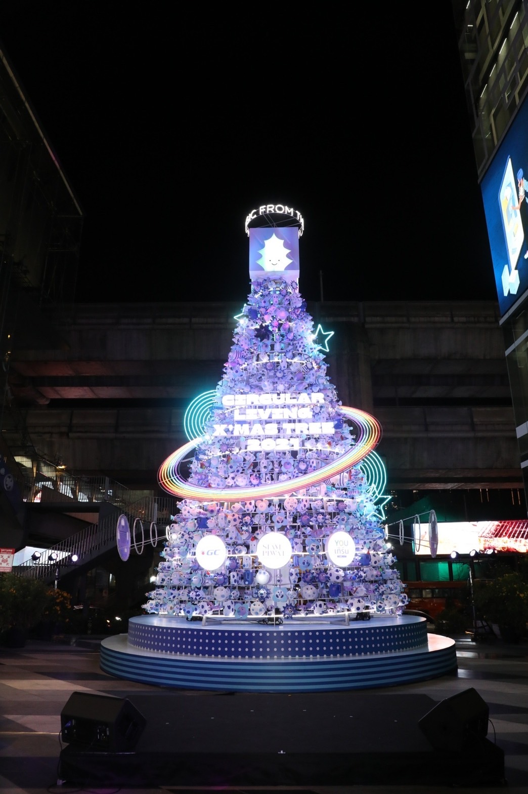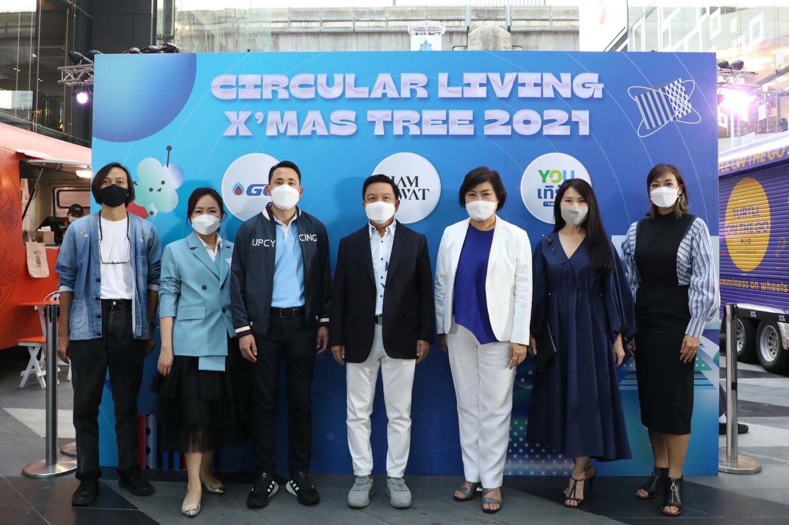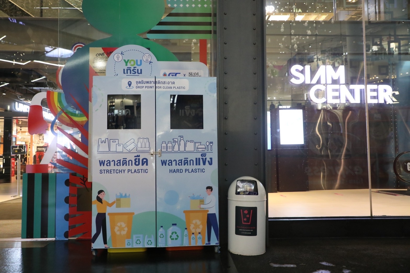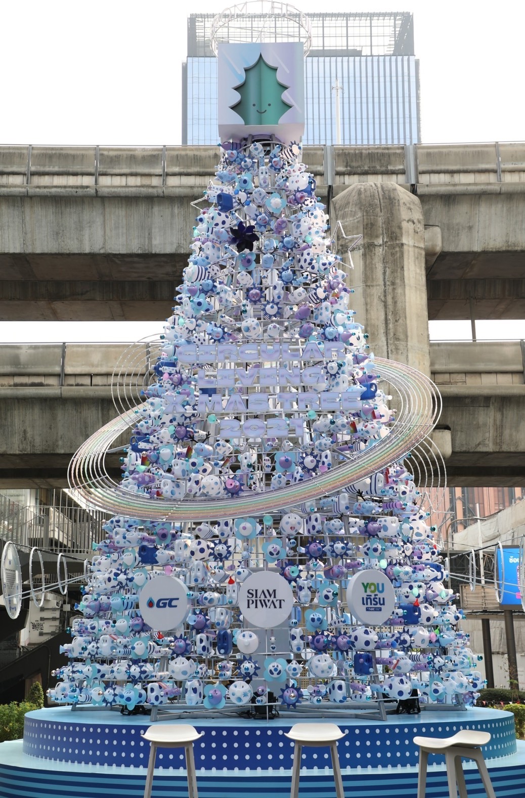 ต้นคริสต์มาสรักษ์โลก “Circular Living X’mas Tree 2021” ร่วมเติมเต็มและส่งมอบความสุขให้กับทุกคน ด้วยดีไซน์ที่มีเอกลักษณ์โดดเด่นไม่เหมือนใคร เพราะจัดทำขึ้นจากขวดพลาสติกขุ่น (HDPE) ใช้แล้วเช่น ขวดนม ขวดแชมพู นำมาสร้างสรรค์ด้วยไอเดียสุดเก๋ ให้กลายเป็นมนุษย์ต่างดาวหน้าตาน่ารักหลากหลายรูปทรง และนำมาประกอบกันเป็นต้นคริสต์มาสต์ ที่มีความสูง 9 เมตร สูงเด่นเชิญชวนให้ทุกคนมาชมในช่วงเทศกาลแห่งความสุข โดยภายหลังการจัดแสดง ขวดพลาสติกขุ่น เหล่านี้ สยามพิวรรธน์ และ GC จะนำไปส่งต่อให้กับ YOUเทิร์น ระบบบริหารจัดการพลาสติกใช้แล้วแบบครบวงจร ที่ริเริ่มโดย GC เพื่อนำพลาสติกไปรีไซเคิล (recycle) ให้เป็นถังแดงสำหรับทิ้งขยะติดเชื้อ และเพื่อให้ทุกคนได้มีส่วนร่วมรักษ์โลกไปด้วยกัน จึงได้นำเอา YOUเทิร์น Drop Point ถังรับพลาสติกใช้แล้วมาตั้งที่ Siam Paragon ชั้น G ประตูทางเข้า ฝั่ง South SIAM CAR PARK ชั้น G หน้า 7-11 และ Siam Discovery ชั้น G ลานพลาซ่า เพื่อนำขวดพลาสติกขุ่นไปรวมกับพลาสติกจากต้นคริสต์มาส ส่งมอบให้ YOUเทิร์นนำไปรีไซเคิลเป็นถังขยะติดเชื้อเพื่อใช้ประโยชน์ต่อไป นับเป็นการส่งเสริมการใช้ทรัพยากรอย่างคุ้มค่าสูงสุด