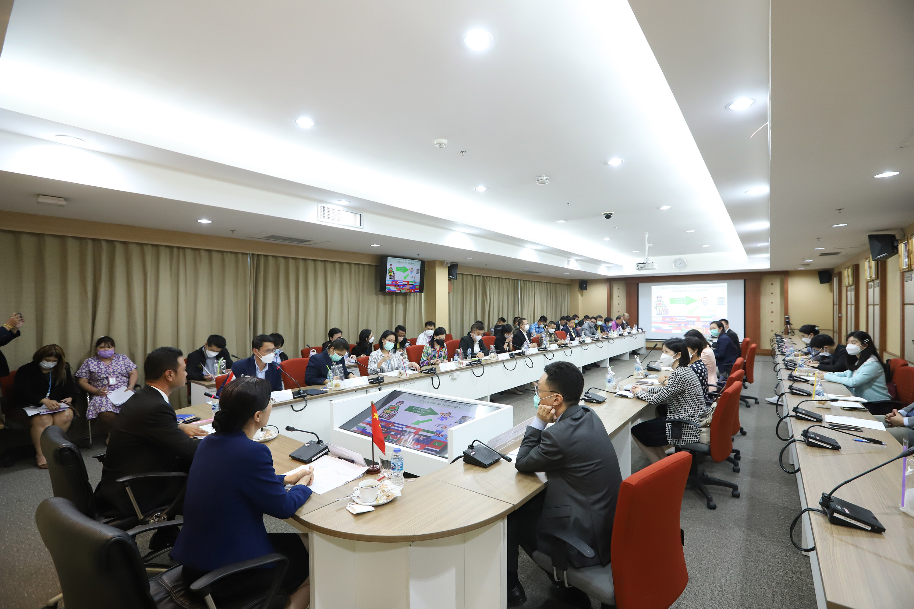นายจาตุรนต์ ภักดีวานิช รองอธิบดีกรมการท่องเที่ยว และ Ms. Pan Jin ที่ปรึกษาและกงสุลใหญ่ สถานเอกอัครราชทูตสาธารณรัฐประชาชนจีนประจำประเทศไทยและคณะ พร้อมด้วยผู้แทนจากสำนักงานปลัดกระทรวงการท่องเที่ยวและกีฬา กรมการขนส่งทางบก กรมเจ้าท่า กองบัญชาการตำรวจท่องเที่ยว สำนักงานตรวจคนเข้าเมือง การท่องเที่ยวแห่งประเทศไทย สภาอุตสาหกรรมท่องเที่ยวแห่งประเทศไทย  บริษัท ท่าอากาศยานไทย จำกัด (มหาชน) สมาคมไทยธุรกิจการท่องเที่ยว สมาคมมัคคุเทศก์อาชีพแห่งประเทศไทย และสมาคมประกอบการธุรกิจท่องเที่ยวสัมพันธ์ไทย – จีน ร่วมประชุมหารือแนวทางดูแลความปลอดภัยสำหรับนักท่องเที่ยวจากสาธารณรัฐประชาชนจีน