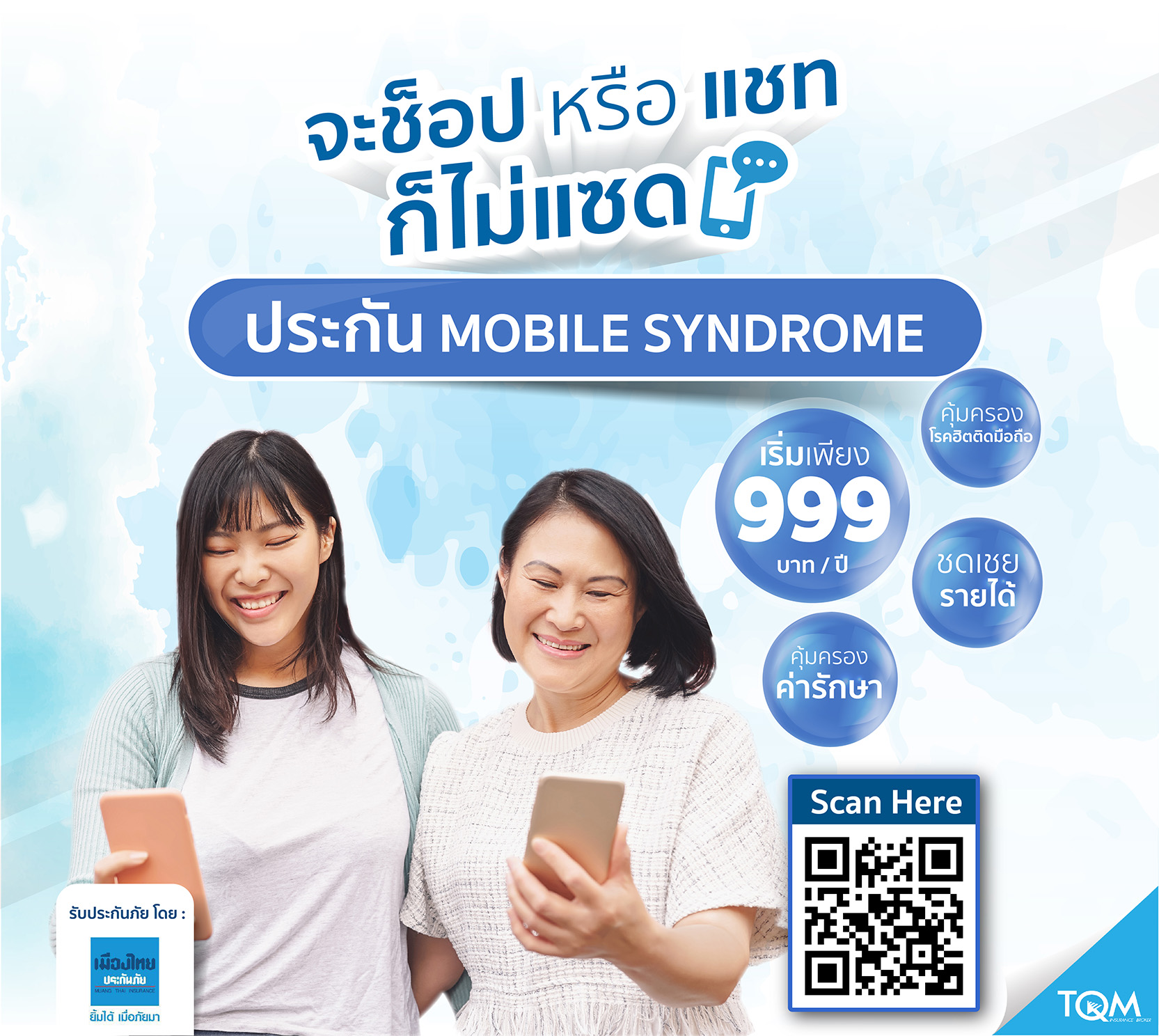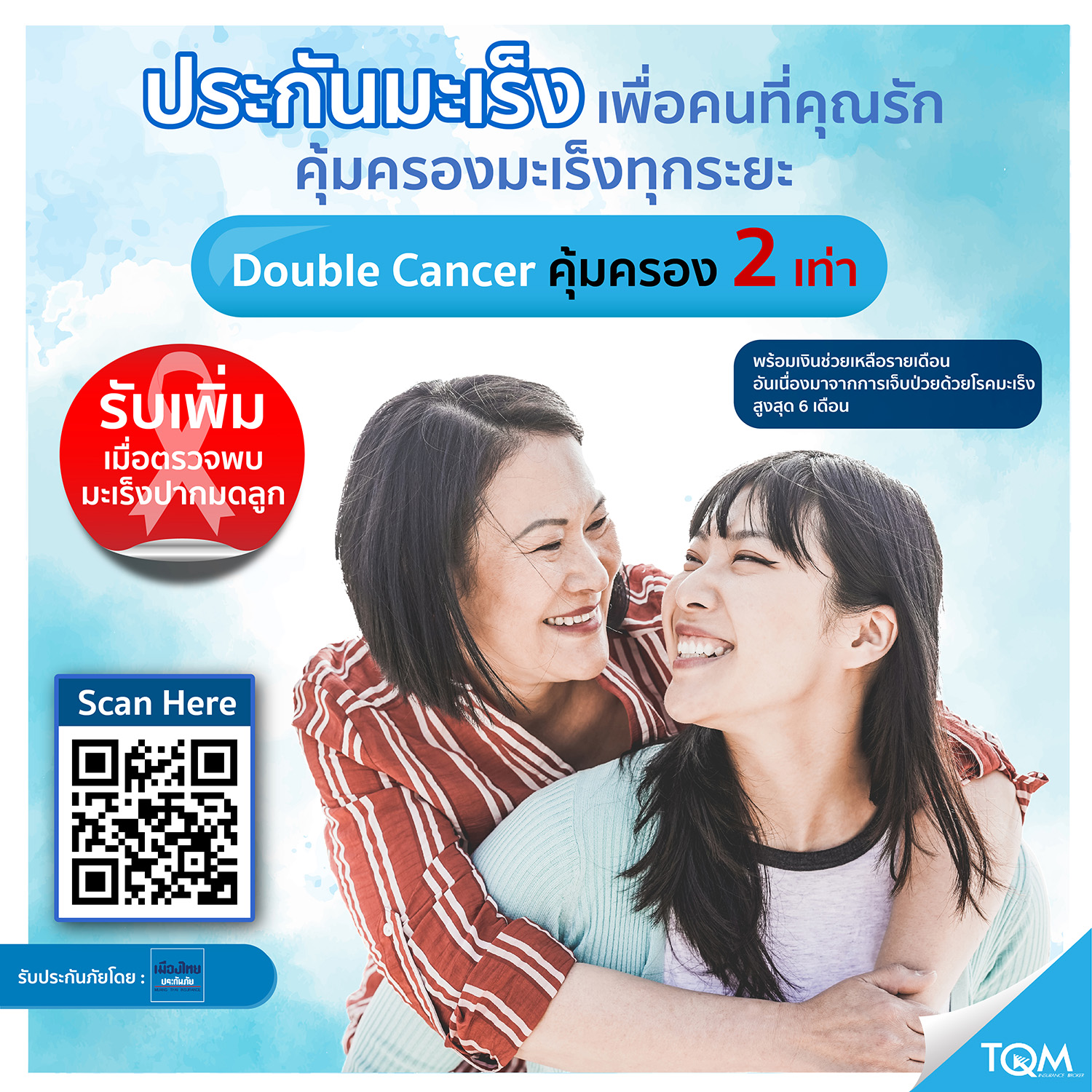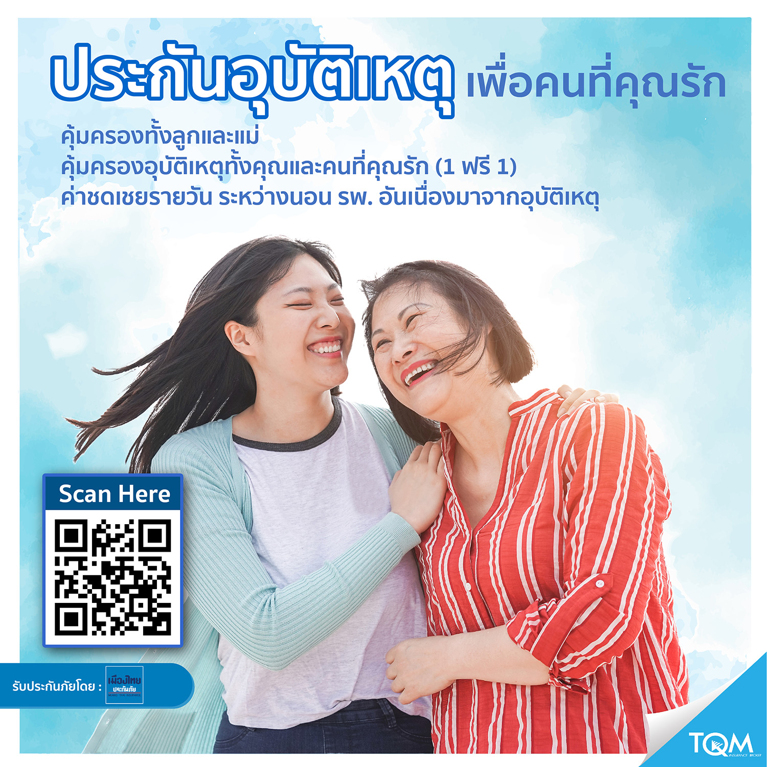 แคมเปญประกัน FOR MOM พร้อมให้ลูกซื้อเป็นของขวัญให้คุณแม่ได้ง่ายๆ ผ่านช่องทางออนไลน์ คลิก https://bit.ly/3lbhwm9 หรือเว็บไซต์ www.tqm.co.th และ Line Official / เฟซบุก TQM Insurance Broker หรือสอบถามรายละเอียดเพิ่มเติมได้ที่สายด่วน 1737